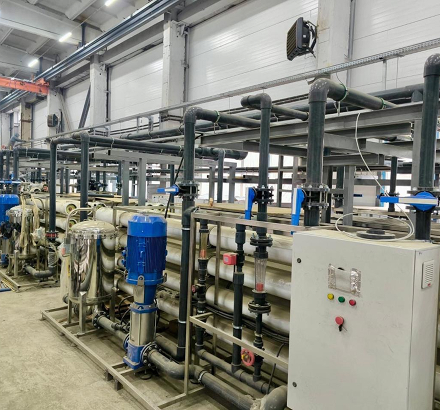 Ultrafiltration system consisting of four units, each with a capacity of 220 m³/h of purified water, total capacity of 880 m³/h. Degree of purification 0.01–0.1 μm. Consists of seven reverse osmosis units, each with a capacity of 60 m³/h of demineralized water, total capacity of 420 m³/h. Degree of purification 0.0001 μm.
